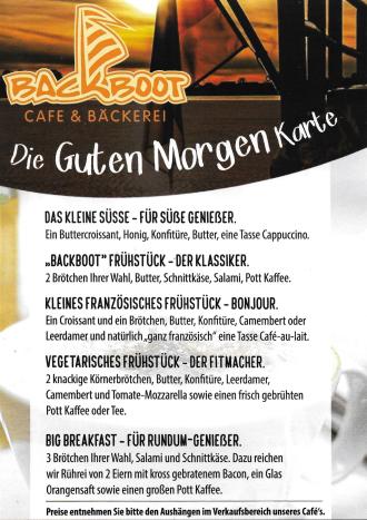 Unsere Frühstücksvariationen lassen keine Wünsche offen. Egal ob klassisch, vegetarisch oder für den Rundum-Genießer ´, Ihr entspannter Start am Morgen beginnt bei uns im "Backboot" Rufen Sie uns rechtzeitig vorher an und wir decken Ihnen den Frühstückstisch, ganz nach Ihren Vorstellungen. Einfach ankommen und schlemmen. Wir freuen uns auf Ihren Besuch.